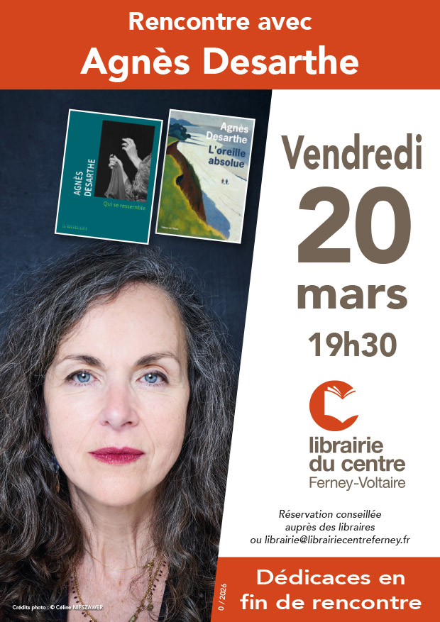 La librairie est heureuse de recevoir Agnès Desarthe, autrice de nombreux romans, qui publie cette année Qui se ressemble aux éditions Buchet-Chastel. Une histoire écrite avec un extraordinaire talent pour dire l’identité et les appartenances multiples, autour d’un personnage clé, sa grand-mère juive-arabe. L’exil, la ferveur, la musique, la langue et l’amour des mots seront au rendez-vous. Et au passage, nous reparlerons de L’Oreille absolue paru chez l’Olivier à la rentrée littéraire de 2025. Deux livres qui disent l’universel dans l’intimité des histoires personnelles, avec légèreté et humour. Une très belle rencontre en perspective. Réservation auprès des libraires ou via : librairie@librairiecentreferney.fr