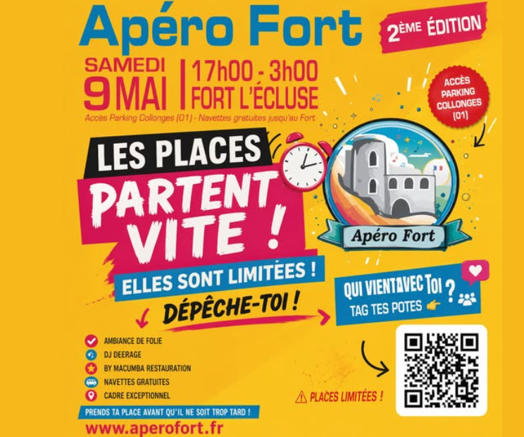 Join us for a wild night of partying in the majestic setting of Fort l'Écluse! Get ready for a festive atmosphere where aperitifs mingle with music and dancing. It's all about conviviality! Come one, come all to support a good cause.
